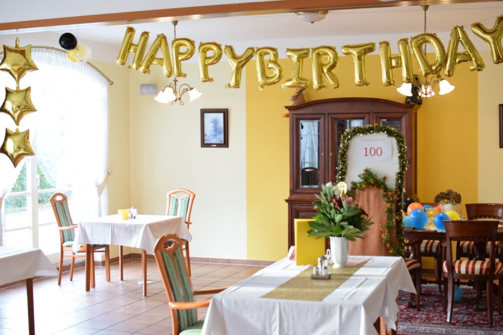 Schon beim Betreten des Wohnbereichs wurde deutlich, dass dies ein ganz besonderer Tag war. Große, goldene Luftballons in Form einer „100“ wiesen den Weg. Überall im Speisesaal setzten festliche Details Akzente: Von glitzernden Ballonschriftzügen mit „Happy Birthday“ bis hin zu liebevoll arrangierten Kommoden mit Leuchtartikeln und Postern.